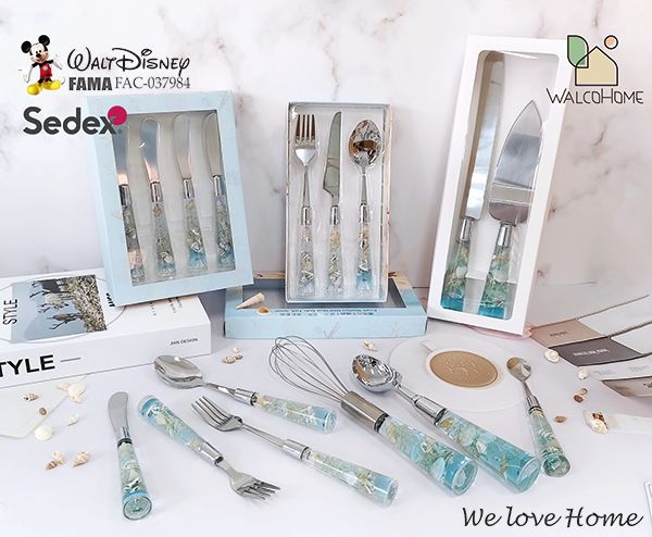2 sizes of Acrylic Handle filled seashells with stainless part, like spreader, fork, spoon, cake knife and spade, ice cream scope, mixer, and so on as a creative and coordinated utensil for use.