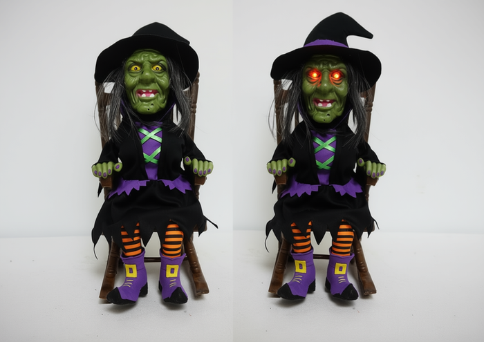 This animated witch comes to life with glowing red eyes, eerie screams, and spine-chilling motion! Dressed in a classic black-and-purple robe with striped socks, she sits on a wooden chair—ready to haunt your Halloween.