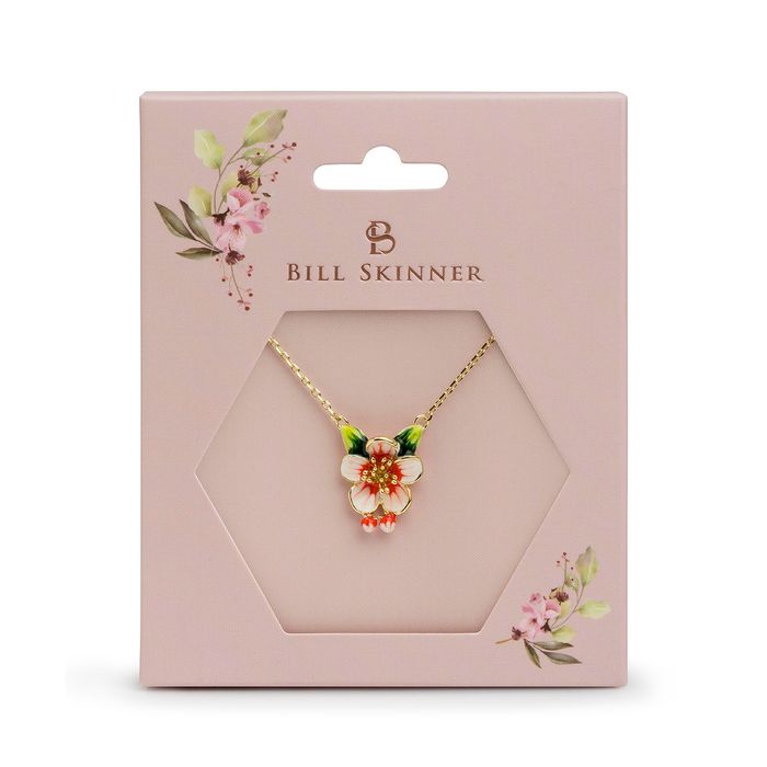 Delicate Apple Blossom & Mouse Pendant Necklace. Embrace the playful charm of nature with this captivating pendant necklace, another animal jewellery creation from Bill Skinner Studio. The centrepiece is a delicate apple blossom, its petals painted in soft hues and accented with a touch of sparkle. The pendant hangs gracefully from a delicate chain, making it a perfect everyday piece.