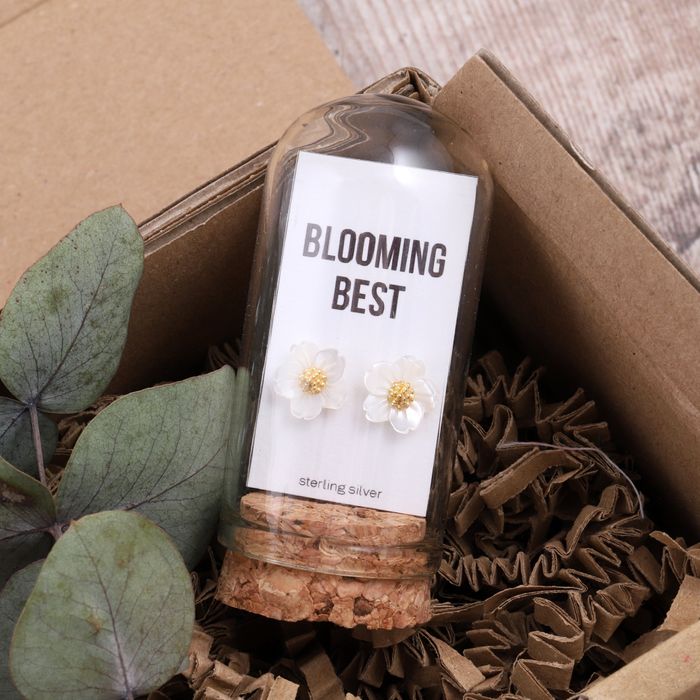 Sterling silver and mother-of-pearl Buttercup earrings presented on our own design message card in a terrarium style glass bottle with a cork base.