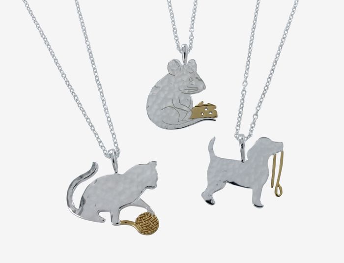 Our Mouse and Cheese Necklace is cute and whimsical. The classic high-shine sterling silver is crafted with precision and care into this charming two-dimensional mouse, complete with adorable detail in its whiskers and a beautifully textured body. The mouse is playfully clasping a block of cheese, finished in 18ct gold plate which is an eye-catching contrast to the sterling silver. The mouse sits centrally on an adjustable 16-18" sterling silver chain.