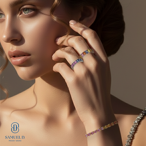 The joy of color meets the prestige of Italian design. An exclusive set featuring eternity rings and a matching bracelet by Samuel D. Preziosi, crafted in 18k gold with a premium white gold finish. A dance of light and precious hues designed for those who wish to stand out with vibrant, sophisticated elegance.