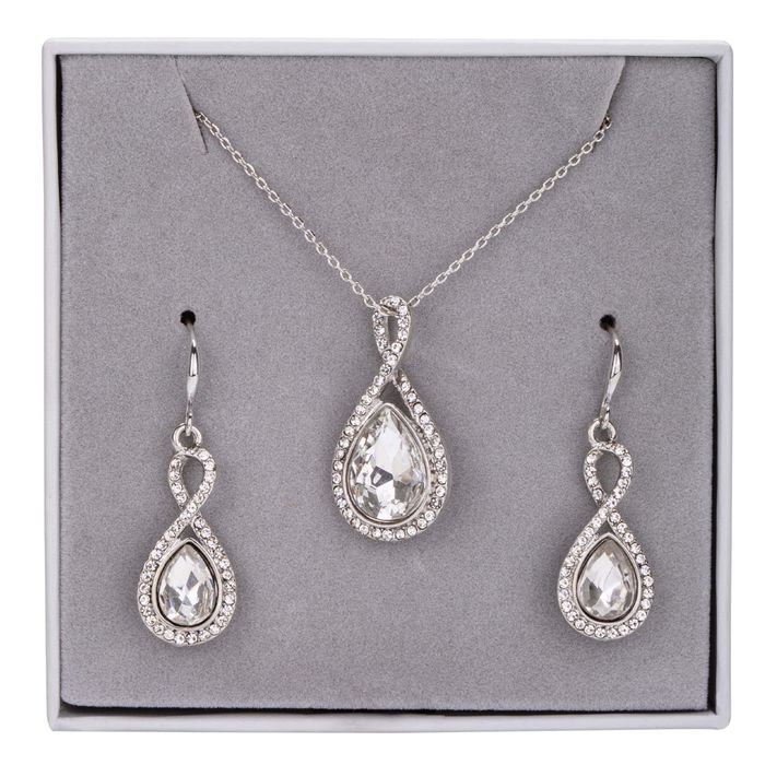 A Beautiful gift for any loved one. Already gift boxed and ideal pick up buy. Perfect for Valentine's and Mother's Day. This Crystal Infinity Pear Drop Pendant Necklace and Earrings Set is available in Gold, Silver and Blue.'