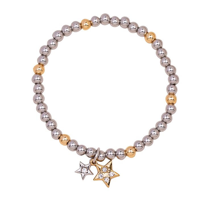 Perfect for stacking and a part of our Emily stacking bracelets collection, this double star bracelet is easy to wear due to its elasticated nature. Mix and match with other colours and motifs to create your own look.' Available in mixed metal and silver