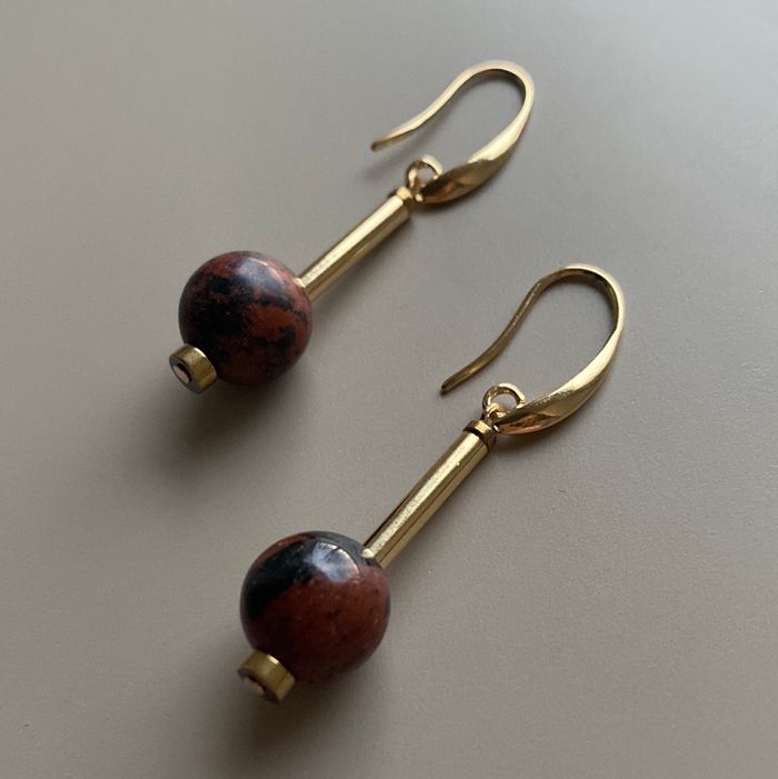 18k Gold plated, brass hooks with Hematite, Mahogany Obsidian, Gold plated brass tubes. Each earring measures from top of the hook 44mmx12mm and weighs 0.10oz