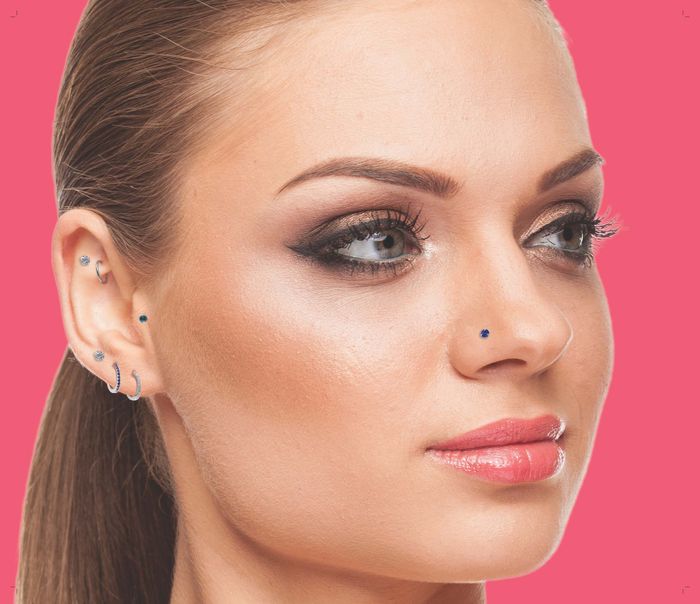 She is wearing a Sterling Silver Round Sapphire Crystal Nose Stud - 2mm (NP318) and Silver CZ Huggie Hoop Earrings with Sapphire and Clear Cubic Zirconia in the lobe piercings (TH974).