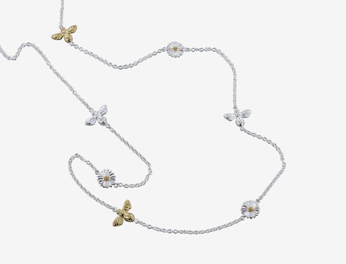 This is simply divine - a longer length'Daisy and Bee Necklace in Sterling Silver and Gold'plate detail that really highlights the intricate design. Four bees sit along side three delicate daisies on an adjustable chain that sits a little longer on the neck so can be worn over clothes and layered with other necklaces.