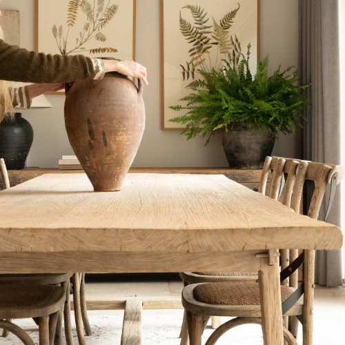 The Dorothy Reclaimed Dining Table, made from reclaimed elm in Tianjin, offers generous seating for 8–10 and features the rich grain of the timber, blending durability with enduring rustic elegance.