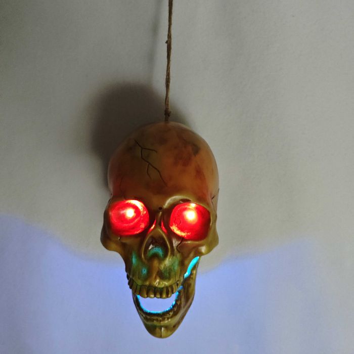 This hanging glowing skull features piercing red LED eyes and an eerie blue-lit mouth—casting an unsettling glow that seems ready to whisper from the grave!