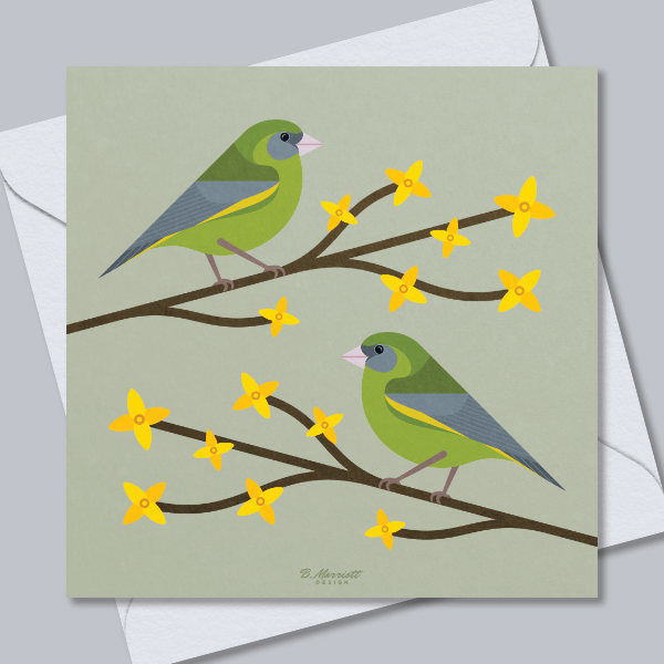 Part of the British birds and wildlife range from contemporary artist Ben Marriott, featuring a graceful pair of greenfinches perching on forsythia, this wildlife greetings card is the perfect gift for any bird-lover!