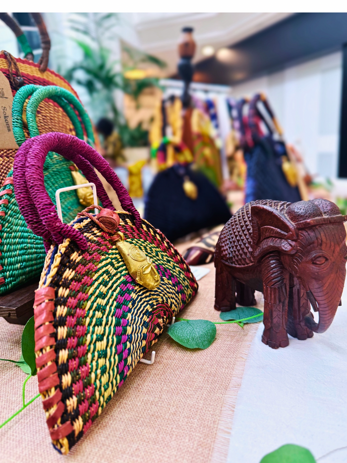 Hand-woven in Northern Ghana using sustainably sourced raffia. Features a bold half-moon silhouette with hand-wrapped handles and a hand-cast brass mask pendant. Lightweight, durable, and uniquely expressive. No two bags are exactly alike.