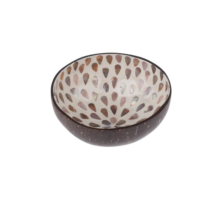 This elegant bowl is made from a natural coconut shell, featuring a stunning inlay of shimmering mother-of-pearl in a teardrop design. Perfect as a centerpiece or for holding small items like jewelry, keys, or trinkets, it combines eco-friendliness with sophisticated design. Its earthy exterior contrasts beautifully with the iridescent interior, making it a unique addition to any home decor.