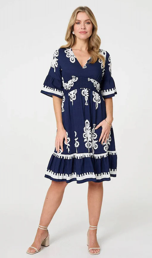 Make a statement in the Ikat Print Cap Sleeve Midi Dress—where timeless silhouette meets eye-catching print. Designed with soft cap sleeves, a flattering waistline, and a flowing midi length, this dress moves beautifully with you from day to night. The rich ikat pattern adds a touch of global-inspired charm, perfect for warm-weather dressing.