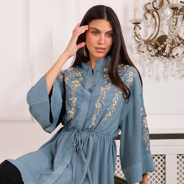 Japanese Blossoms Champagne Metallic Embroidered Selene Dress