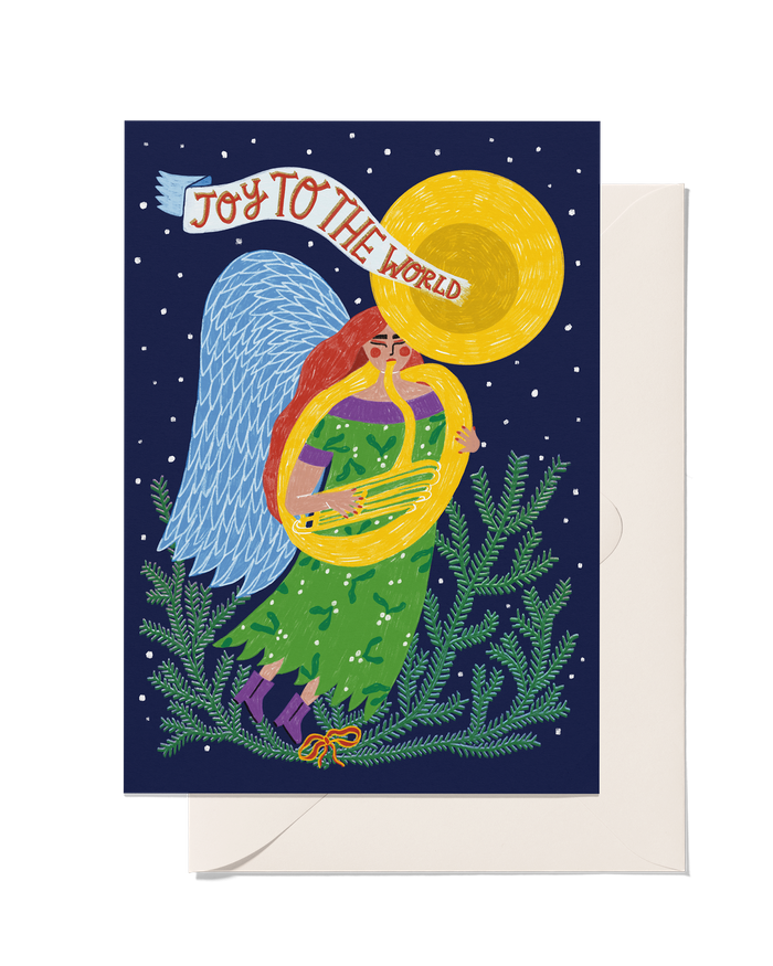Foil enhanced A6 Christmas greeting card printed in the UK on FSC certified board. Fun, bold and whimsical angel design. Blank inside, supplied with envelope.
