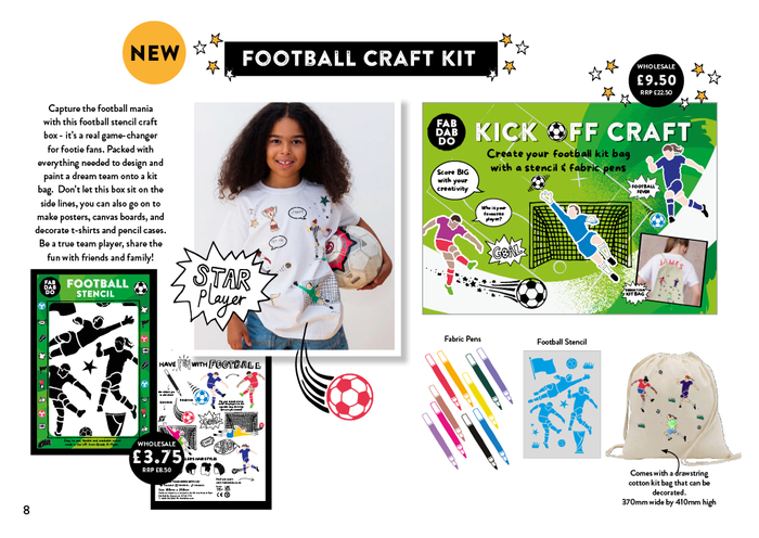 This all-in-one set includes double-ended fabric pens, a beautifully illustrated footballer stencil, a fun activity sheet, stickers, and a durable organic cotton bag that’s perfect for everyday use from match days and PE kits to days out and holidays.