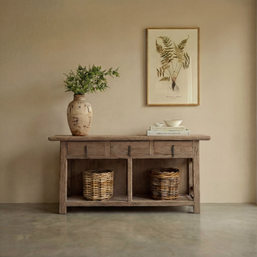 These console tables are made from reclaimed wood that once formed part of rural Chinese structures. Each piece carries subtle marks of its former life, giving it a unique sense of character. Slim, functional, and easy to style, they sit beautifully in hallways, living rooms, or alongside existing furniture arrangements.