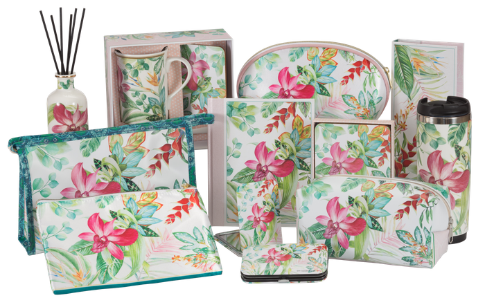 A range of gift lines including mug set, diffuser, cosmetic bags, notebooks,manicure set, compact mirror and coasters in a matching Orchid Cascade design.