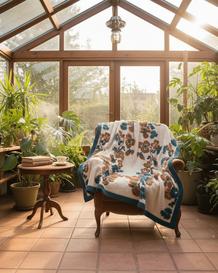 Soft, breathable, and naturally insulating, it’s ideal for slow moments in the conservatory, cosy evenings on the sofa, or as an elegant decorative accent. Every detail tells a story of Tuscany: carefully selected regenerated fibres, respect for nature, and the quiet poetry of handmade work.