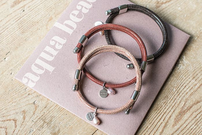 Our bracelet collection, Aqua Beach, is crafted in St Ives, Cornwall, with premium leather and stainless steel, paired with recycled paper packaging. The leather has a soft textured effect and is complimented with a freshwater pearl.