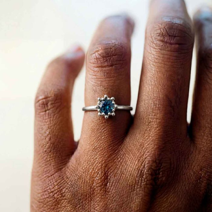 Add a touch of the coast to your jewellery box with the Mini Silver Zaria Ring. Made from recycled sterling silver, this dainty ring features a 5mm faceted London blue topaz, known for its vibrant colour and brilliant sparkle. The barnacle-inspired setting brings a subtle marine feel, blending natural texture with a modern look.