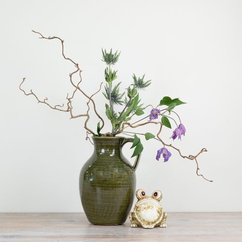 Introducing our exquisite ceramic jug, featuring a charmingly rustic exterior and a rich emerald glaze.