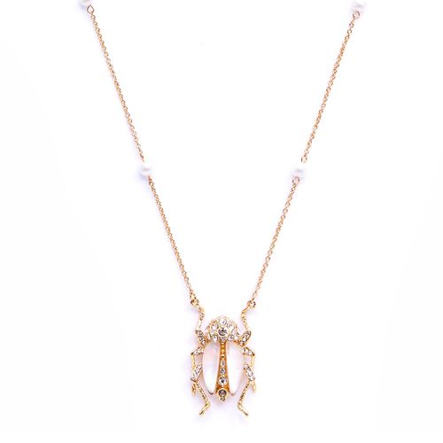 A singular beetle pendant crafted with glass simualted pearls and sparkling crystals.