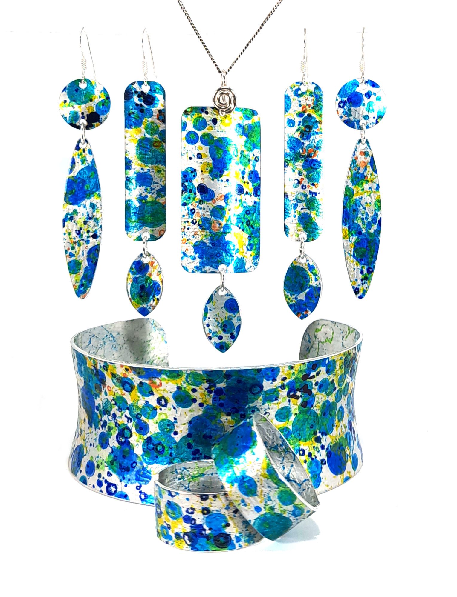 A textured metal with a colour combination of blue, teal and orange. The image sows large and small elipse earrings, with a rectangular pendant, rings and pendant.