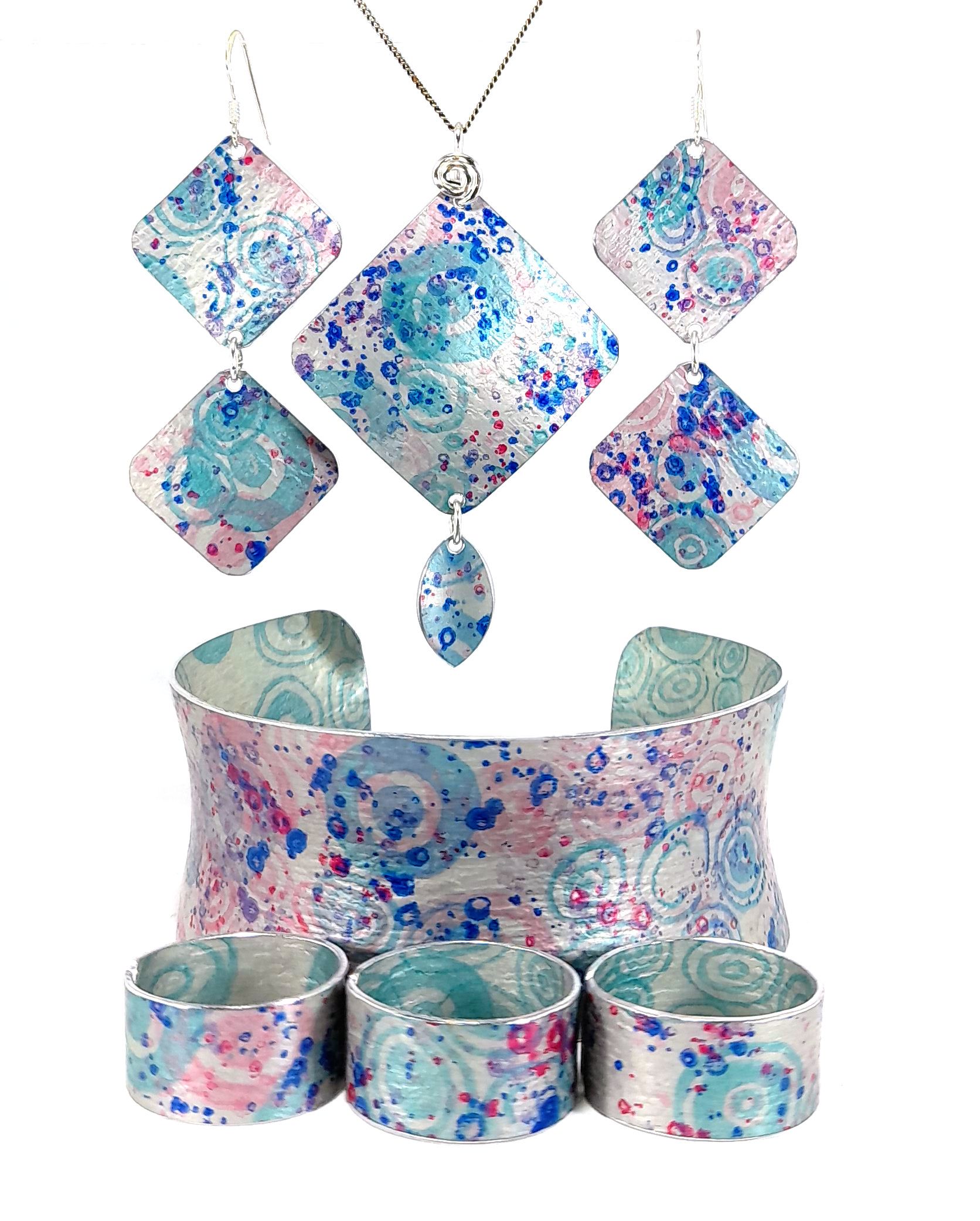 Textured aluminium with a pattern of orange, yellow and pink bubbles. The image shows bangle, rings, pendant and 2 pairs of earrings. All earrings have sterling silver chains. All pandants have an 18" ...