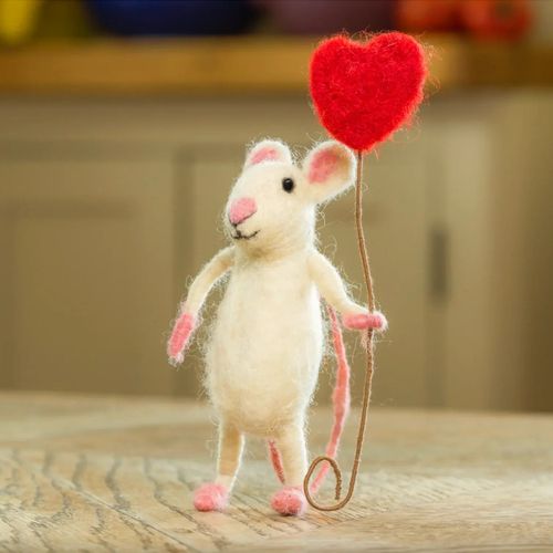 Joyful little Happy Heart Ballon Mouse is holding a red heart shaped balloon, high up for all to see ...