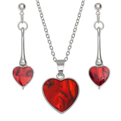 Red heart design pendant on trace chain inlaid with red Paua shell and matching long drop stud earri ...