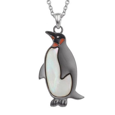 Emperor penguin inlaid with mother of pearl shell. Pendant is supplied on a trace chain, matching ea ...