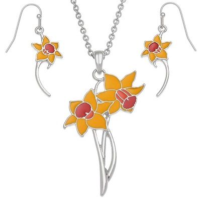Bright yellow daffodils necklace & hook earring set Enamel painted 18/20" chain, pendant 45mm high S ...